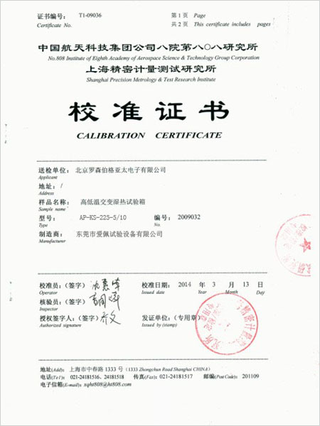 高低溫交變校準(zhǔn)證書