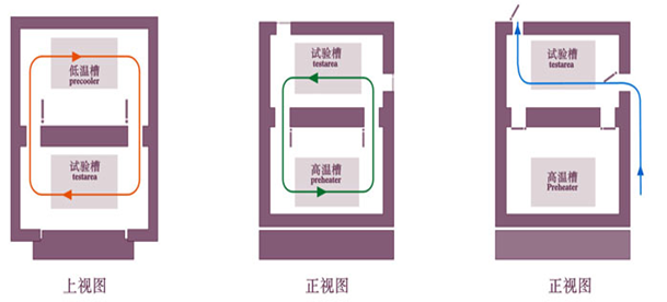 結構分為高溫區、低溫區、測試區三部分,測試樣品完全靜止于測試區。采用獨特之蓄熱、蓄冷結構,強制冷熱風路切換方式導入測試區,沖擊時高溫區或低溫區的溫度沖入測試區進行沖擊,完成冷熱溫度沖擊測試。