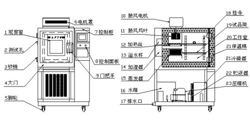 可編程高低溫濕度試驗箱的結構特征:外殼:304不銹鋼拉絲工藝處理或靜電噴涂可選,內壁:采用進口SUS304優勢不銹鋼,保溫材料:硬質聚氨脂發泡,具有超低溫熱傳導率,耐候保溫等特點,試驗箱門密封:進口硅膠密封條,箱門:左開單開門方式,觀察窗:發熱防汗多層真空大玻璃觀察視窗,控溫濕方式:BTHC平衡調溫調濕,加熱:不銹鋼翅片空氣加熱,加濕:淺槽蒸汽加濕,測試孔:Φ50(帶軟質耐老化橡膠塞),試驗箱排水口:標配1/2內箱凝結水及機組余水排水口,照明燈:廣角照明防爆節能燈1組,試品層架:304不銹鋼材料層架2層,每層承重25Kg,溫濕度控制器:進口韓國三元或臺灣臺通智能數顯PID控制儀表,高精度顯示,制冷系統:原裝法國進口泰康全封閉壓縮機,單級制冷或復疊式低溫制冷系統,整機所有結構及系統設計安裝合理,故障率低,并可經久耐用。