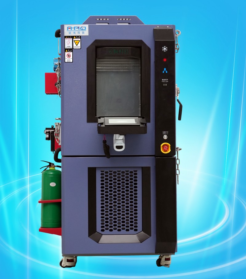- 愛佩生產的鎳氫電池恒溫恒濕試驗箱防爆原理:利用滅火器及噴水進行雙重滅火,泄壓輔助達到防爆目的,若樣品在設備內箱測試過程中發生爆裂,產生的煙霧第一時間會啟動防爆系統,經由內部抽氣泵排入裝煙感器的罩子內,感應后即觸發滅火器開關,滅火器內干冰噴入內箱進行滅火,緊接著噴淋裝置噴水再進行二次滅火。當內箱氣壓過大時,泄壓孔會被沖開,即完成泄壓工作。
